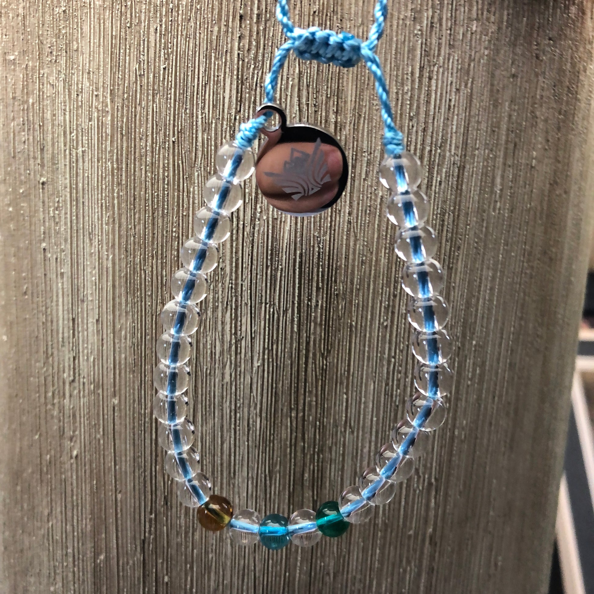 Our beautiful Clean Rivers Fund sponsor bracelet re-envisioned with glass beads. These recycled glass beads have a generous weight and clarity. There are 29 beads that measure 6mm, compared to our WR1 Plastic bracelet with 21 plastic beads that measure 8mm apiece. You will love the feel on your wrist of this beauty.